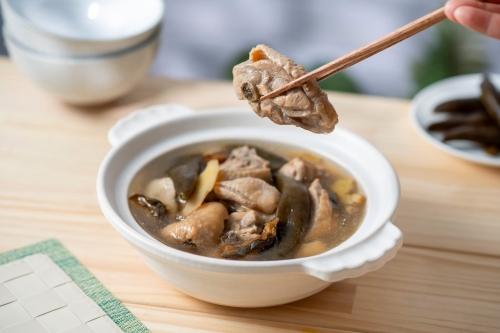 使用黑羽土雞與陳年老薑、黑麻油、米酒文火熬製而成一盅濃郁香氣、肉質鮮甜的麻油雞湯