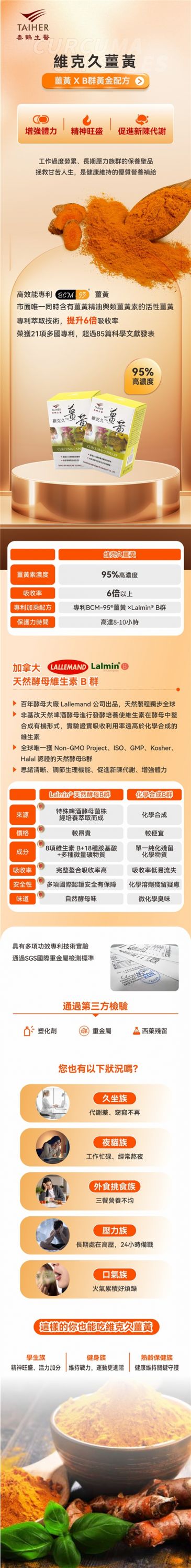 精神旺盛 X 拯救甘苦 X 促進新陳代謝 ∎高效能專利BCM-95®薑黃達95%高濃度 ∎專利萃取技術,提升6倍吸收率 ∎加拿大Lalmin®天然酵母,完整補充8種維生素B群與礦物質 ∎工作過度勞累、長期壓力族群的保養聖品 ∎經第三方SGS檢驗(重金屬、塑化劑、西藥農藥殘留) 通過