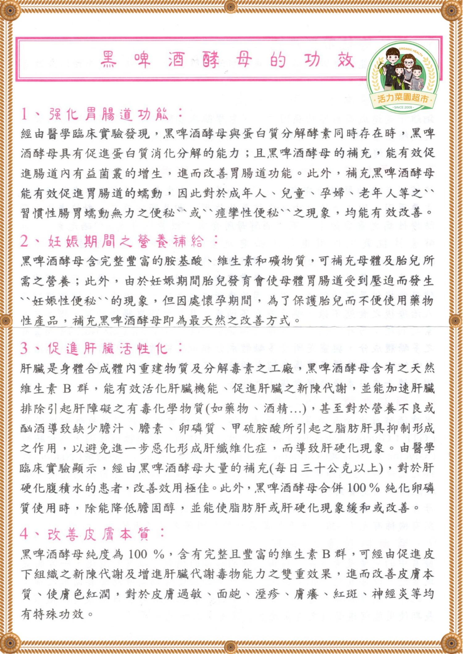 黑啤酒酵母的外壁細胞所含的多醣體和靈芝類相同。本品提供完整又豐富之維生素B群成分,純天然成分,可長期安心食用無負擔。